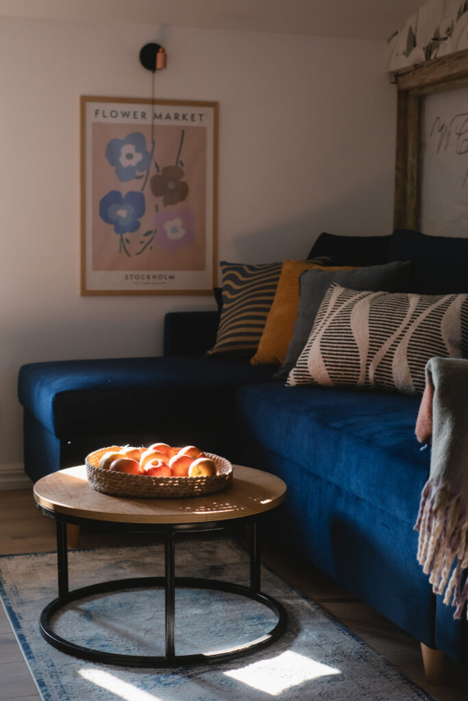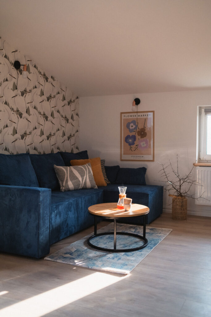 W środku znajdziesz przestronny salon z aneksem kuchennym, osobną sypialnię i łazienkę. W chłodniejsze wieczory możesz ogrzać się przy klimatycznym piecu kaflowym, a latem wypić poranna kawę na tarasie wychodzącym na ogród i sad.