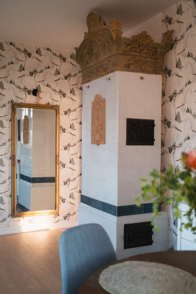 Przytulny apartament z piecem kaflowym i widokiem na sad.
