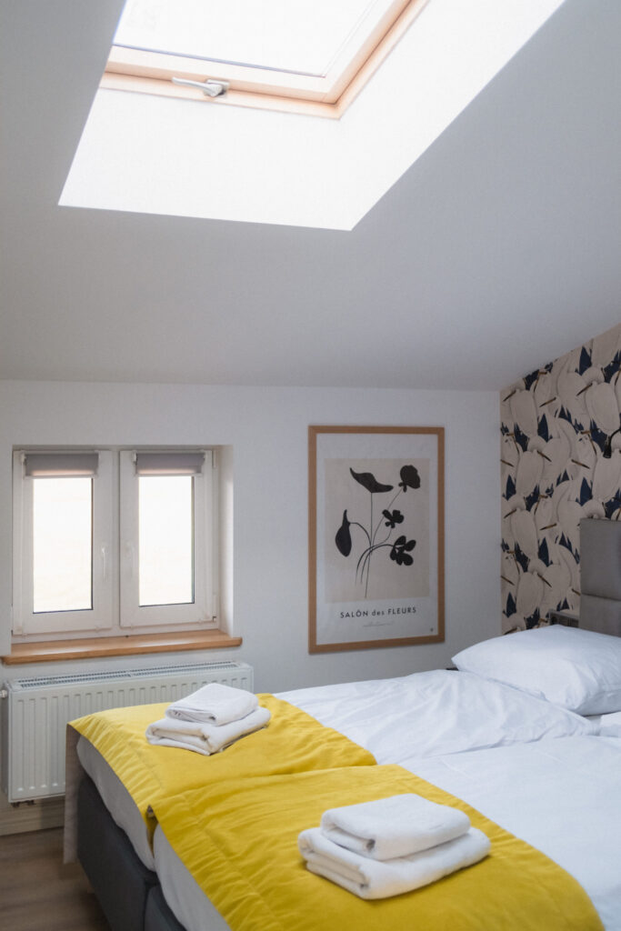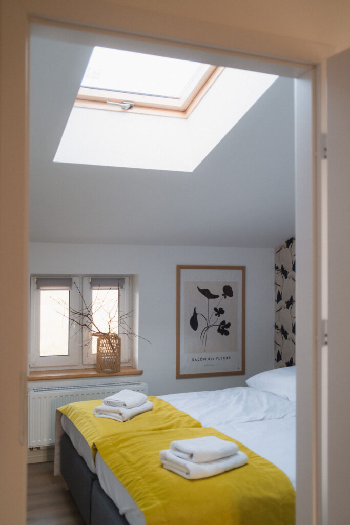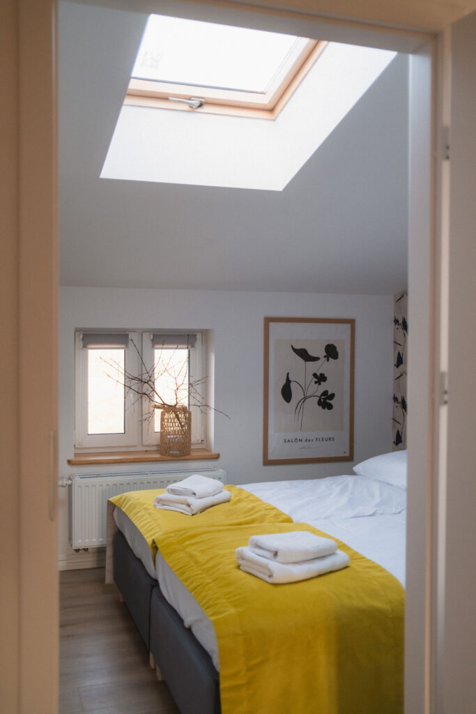 Podobnie jak apartament nr 3, ten apartament oferuje osobną sypialnię, pokój dzienny z aneksem kuchennym, łazienkę i balkon z widokiem na otwarte pola. Jasne wnętrza i spokojna okolica sprzyjają relaksowi- to doskonale miejsce na odpoczynek od codziennego zgiełku.