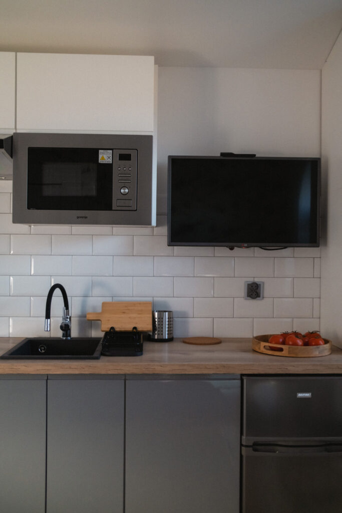 Idealny dla jednej osoby lub pary poszukującej prostej i funkcjonalnej przestrzeni. Wnętrze typu studio z aneksem kuchennym, łazienką rozkładaną sofą w jednej przytulnej przestrzeni. Dla tych, którzy cenią minimalizm i bliskość natury bardziej niż metraż.