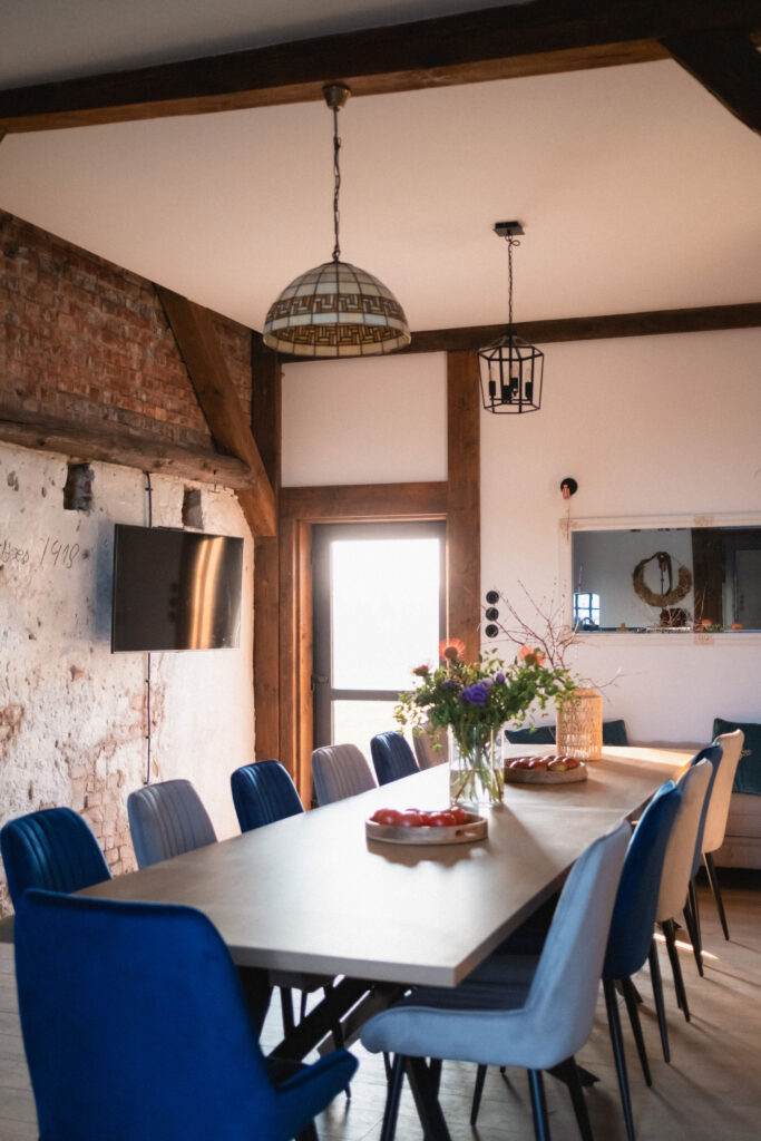 Zachowaliśmy oryginalny charakter budynku-drewniane belki, stare mury i naturalne wykończenia tworzą atmosferę, która sprzyja odpoczynkowi, rozmowie i wspólnemu świętowaniu.